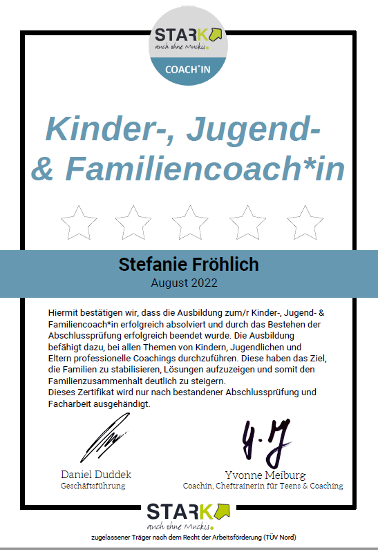 „Inzwischen kann ich mehr los lassen und meinem Kind wieder vertrauen. Schule werden wir schon irgendwie hinbekommen. Steffi hat mir einfach mal zugehört und mir tollen Input gegeben. Der Familien Kalender hilft uns auch sehr in unserem Alltag. Danke für dein Coaching.“